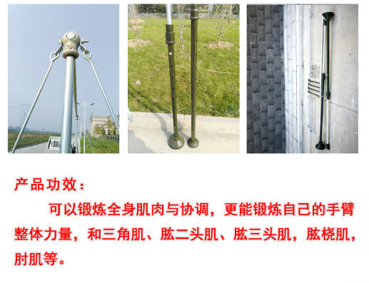 杠面:为直径 28mm 弹簧钢,42mm,厚 3mm,内升降长2.2米,镀锌。杆为直径 28mm 弹簧钢,长 1.2米,镀锌。