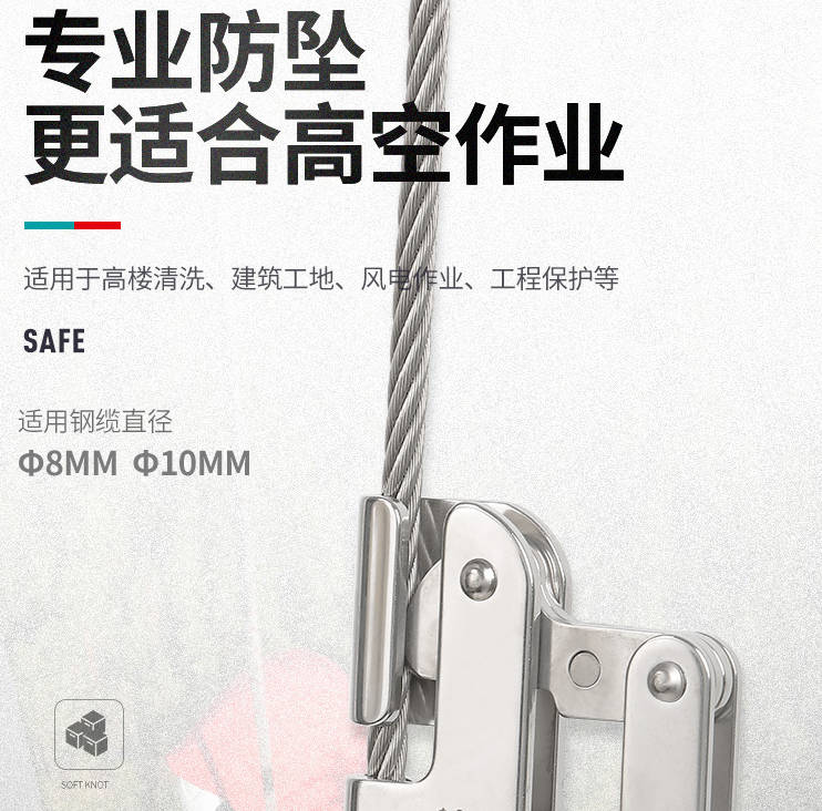 钢丝绳攀爬攀登防坠落自锁器防坠器抓绳器止坠器风电安装装备 品牌Xinda/欣达 XD-Q9695 风电钢缆止坠器 不锈钢 8MM 1OMM 12MM宽7.6CM 高14CM 1.1cm 1.3cm 重484g 适用范围电力工程 电信工程 风电系统 工程保护 高空安装 外墙清洗等高空作业时的保护